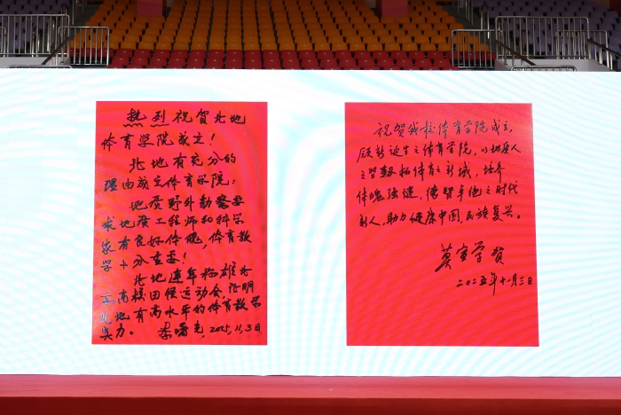 中国科学院院士李曙光、中国科学院院士莫宣学发来贺信,对学院成立表示祝贺,并勉励学院要以地质工作者的坚韧精神开拓体育教育新领域,着力培育体魄强健、德智卓绝的时代新人。